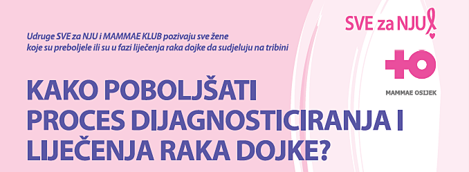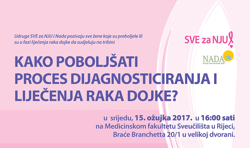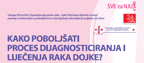 Udruge SVE za NJU, Županijska liga protiv raka – Split te Klub žena liječenih na dojci pozivaju sve žene koje su preboljele ili su u fazi liječenja RAKA DOJKE da sudjeluju na tribini KAKO POBOLJŠATI PROCES DIJAGNOSTICIRANJA I LIJEČENJA RAKA DOJKE? u utorak, 4. travnja 2017. u 17:00 sati Klinički bolnički centar Split, Spinčićeva 1 Velika predavaonica Firule U [...]